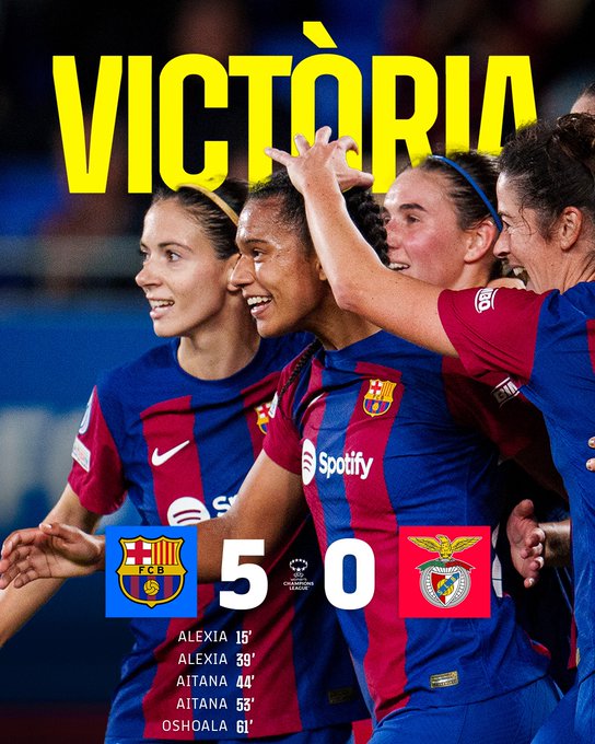 El FC Barcelona inició con el pie derecho la defensa de su título de la Champions League Femenil, con una aplastante victoria (5-0) sobre el Benfica, este martes en la primera jornada del grupo A del máximo torneo continental.