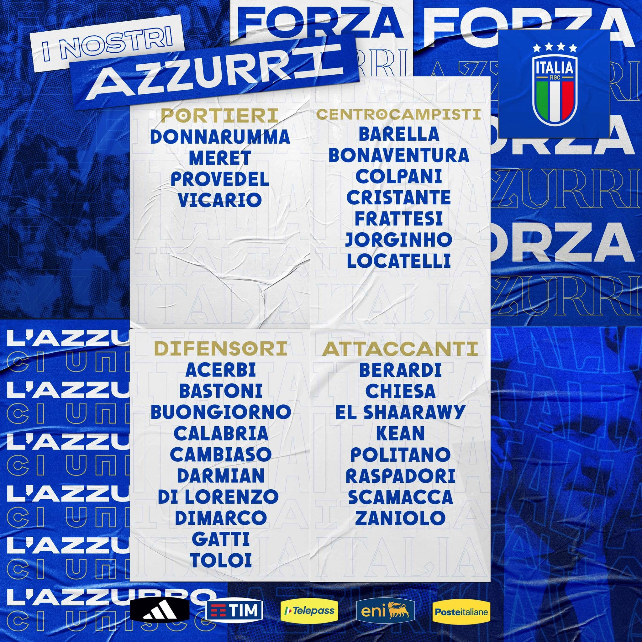 Defensas: Francesco Acerbi (Inter de Milán), Alessandro Bastoni (Inter de Milán), Alessandro Buongiorno (Torino), Davide Calabria (AC Milan), Andrea Cambiaso (Juventus), Matteo Darmian (Inter de Milán), Giovanni Di Lorenzo (Napoli), Federico Dimarco (Inter de Milán), Federico Gatti (Juventus), Rafael Toloi (Atalanta)