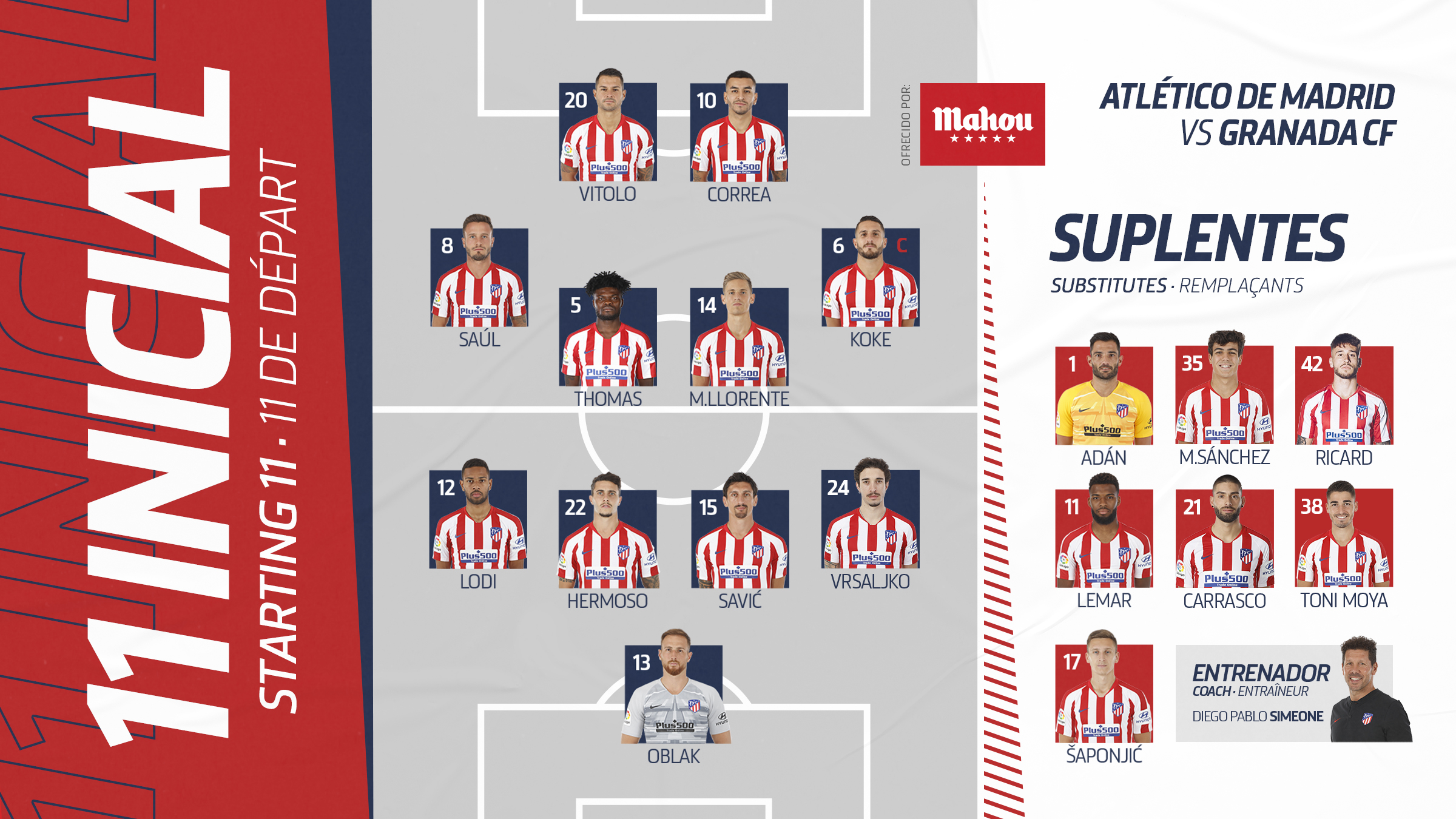 Diego Simeone, su entrenador, alinea a Jan Oblak, en la portería; Sime Vrsaljko, Stefan Savic, Mario Hermoso y Renan Lodi, en la defensa; Koke Resurrección, Marcos Llorente, Thomas Partey y Saúl Ñíguez, en el centro del campo; y Vitolo y Correa, en la delantera, con lo que Ivan Saponjic comienza como suplente.