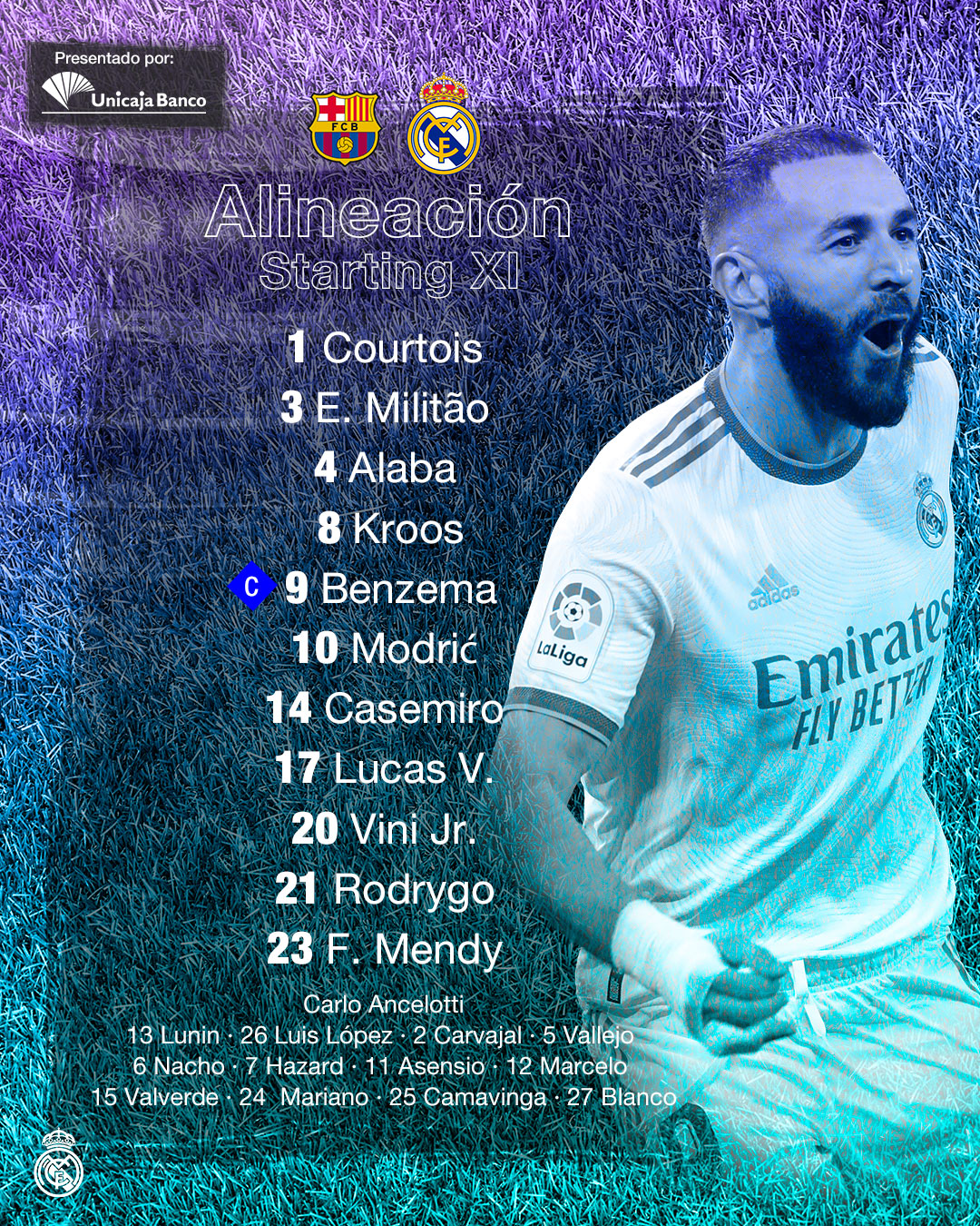 Thibaut Courtois (P); Ferland Mendy, Éder Militao, David Alaba, Lucas Vázquez; Casemiro, Toni Kroos, Luka Modric; Vinicius Jr., Rodrygo y Karim Benzema.