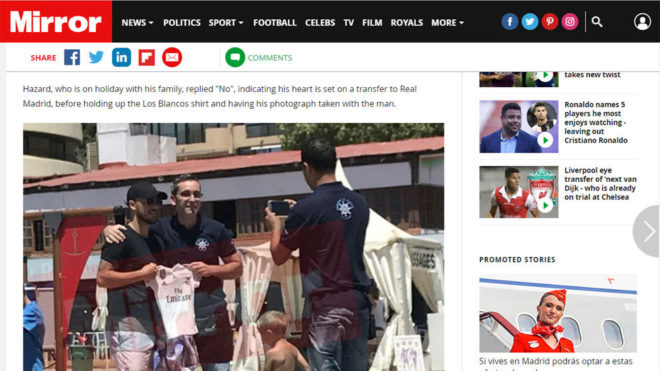 El diario británico, Daily Mirror, mostró imágenes en las que se ve a Hazard en Marbella al lado de un aficionado y posando con una camiseta del Real Madrid.