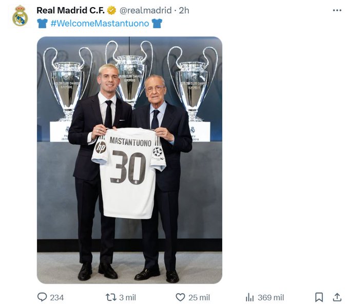 "Gracias a toda la gente de Argentina, que es muy especial para mí. Tengo que seguir aprendiendo, pero prometo que voy a dejarme la vida por esta camiseta", prosiguió Mastantuono, cuya presentación coincidió con su cumpleaños número 18.