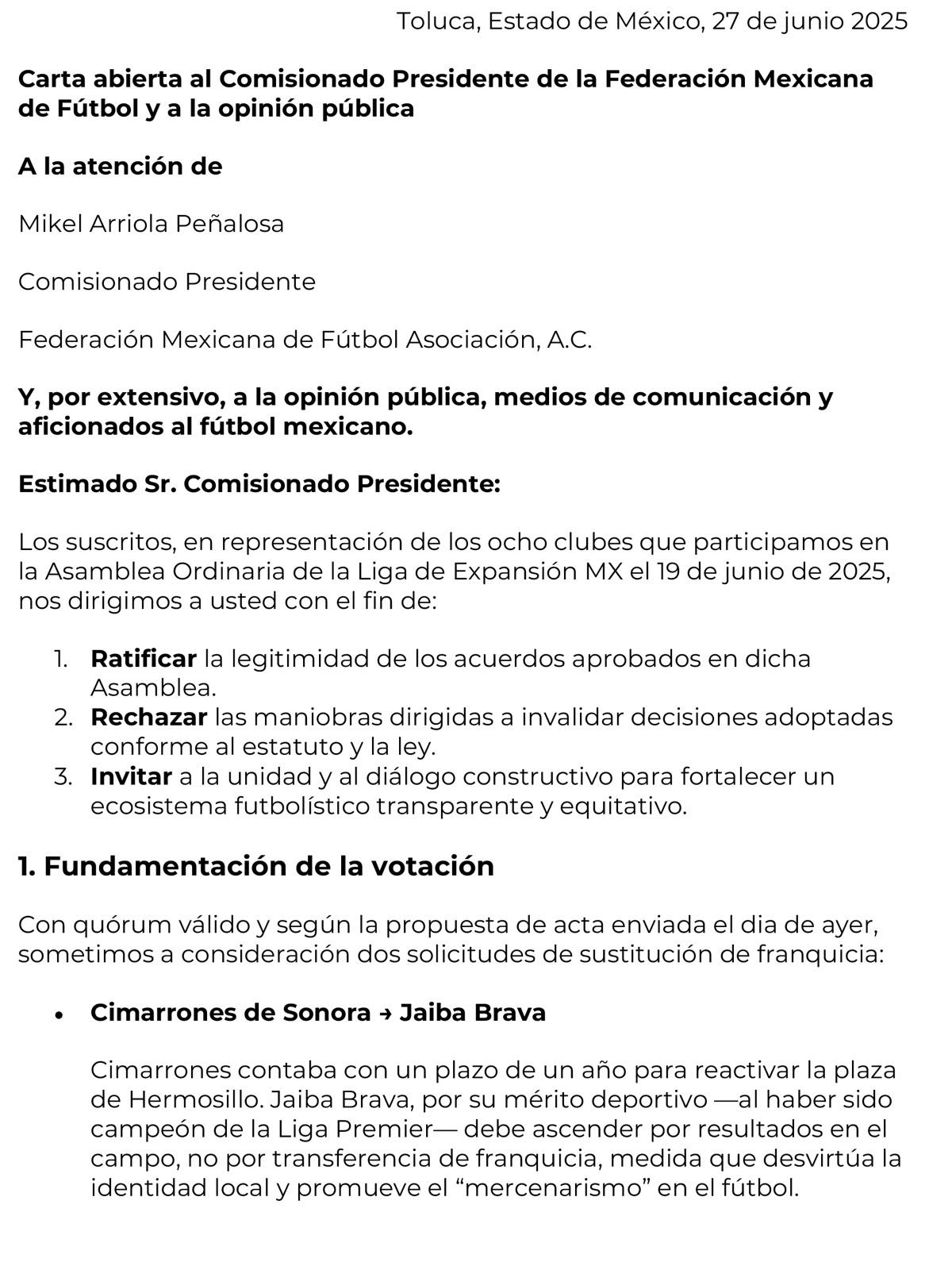 Ocho clubes de la Liga de Expansión MX hicieron pública una carta dirigida al comisionado presidente de la Federación Mexicana de Futbol, Mikel Arriola, en la que ratifican los acuerdos tomados en la Asamblea Ordinaria del pasado 19 de junio y rechazan cualquier intento de revertir dichas decisiones mediante interpretaciones arbitrarias.