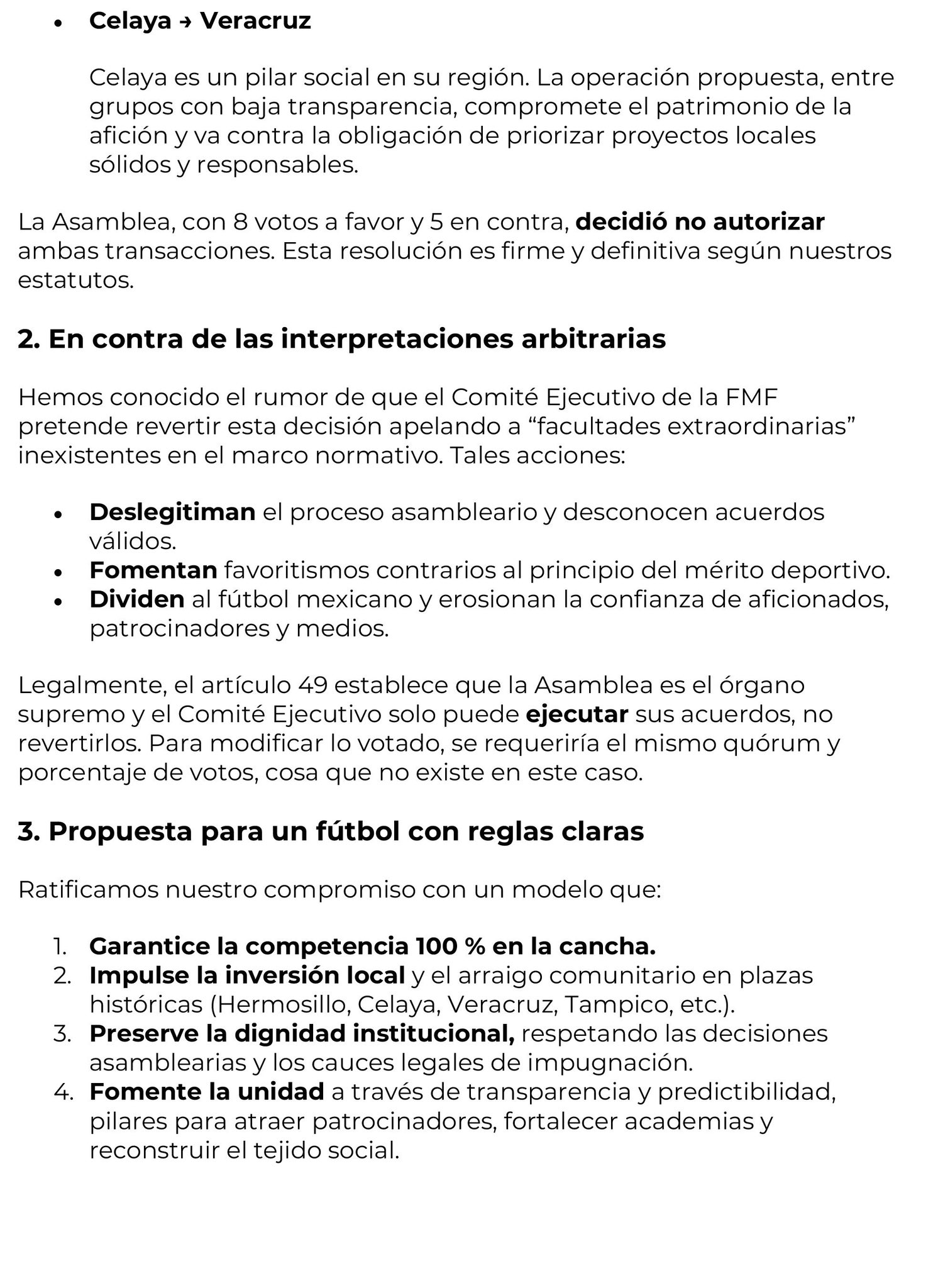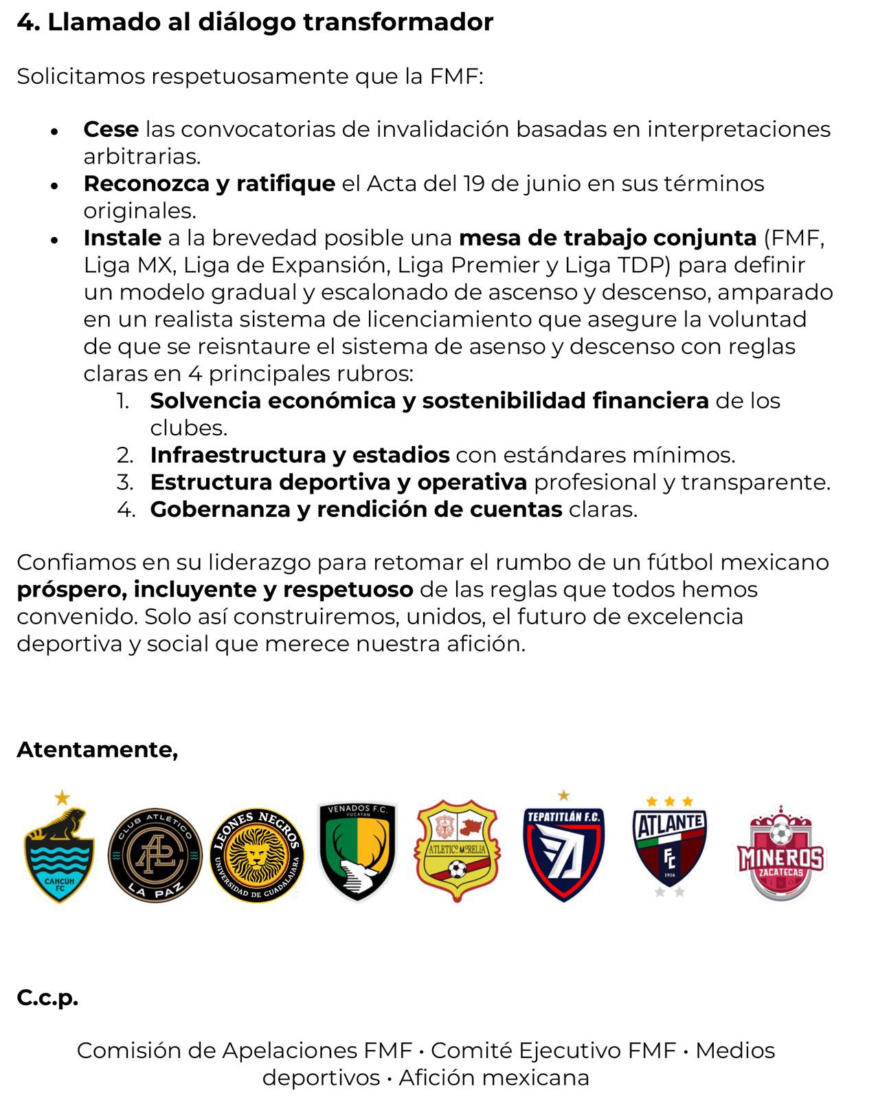 Asimismo, solicitaron a la Federación Mexicana de Futbol frenar cualquier intento de invalidar los acuerdos votados en Asamblea, reconocer y ratificar el acta del 19 de junio en sus términos originales, e instalar una mesa de trabajo conjunta con representantes de todas las ligas para definir un modelo gradual de ascenso y descenso con reglas claras, sustentado en criterios como viabilidad financiera, infraestructura adecuada, estructura operativa profesional y gobernanza transparente.