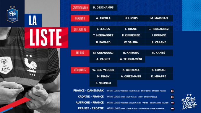 Delanteros (7): Wissam Ben Yedder (Mónaco/FRA), Karim Benzema (Real Madrid/ESP), Kingsley Coman (Bayern Munich/GER), Moussa Diaby (Bayer Leverkusen/GER), Antoine Griezmann (Atlético de Madrid/ESP), Kylian Mbappé (PSG/FRA), Christopher Nkunku (Leipzig/GER).