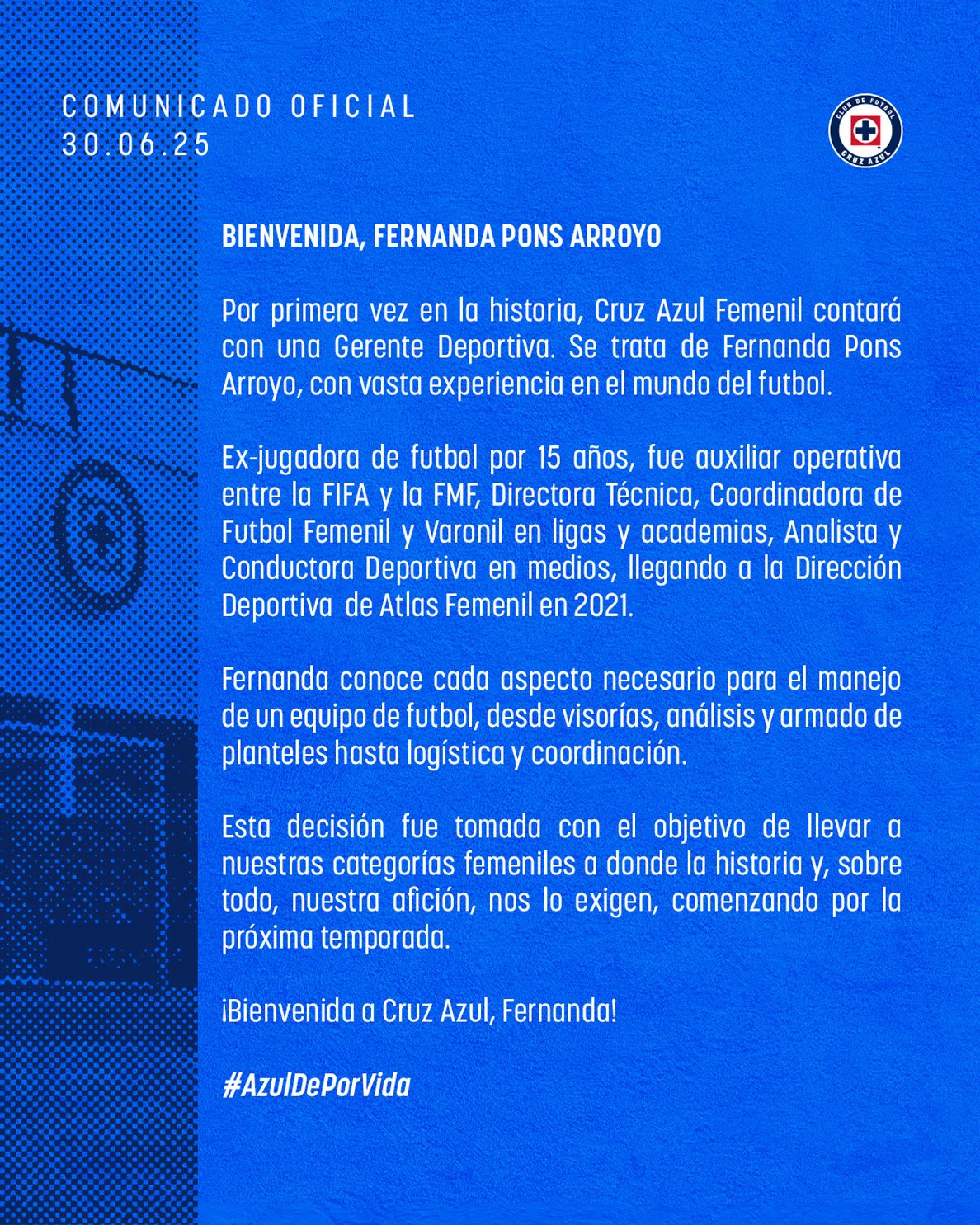 En busca de tener un proyecto más sólido, Cruz Azul Femenil anunció a su primera gerente deportiva de la historia. Se trata de la ex jugadora Fernanda Pons, quien fue futbolista por más de 15 años y también ha tenido impuestos en la FIFA y en FMF.