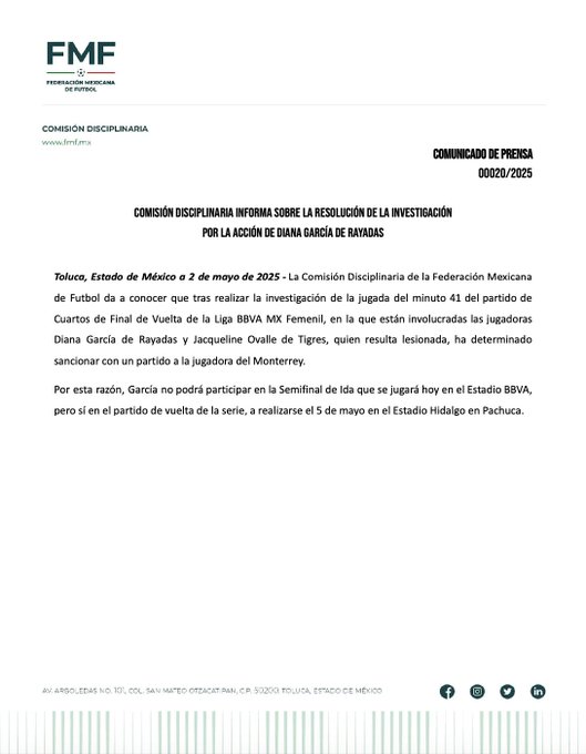 La Comisión Disciplinaria, por medio de un comunicado, informó sobre la sanción que recibió la jugadora del Monterrey.