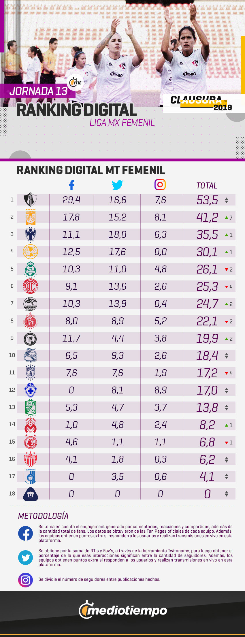 Mediotiempo presenta el Ranking Digital donde se evalúan las redes sociales de los dieciocho Clubes de la Liga MX Femenil.