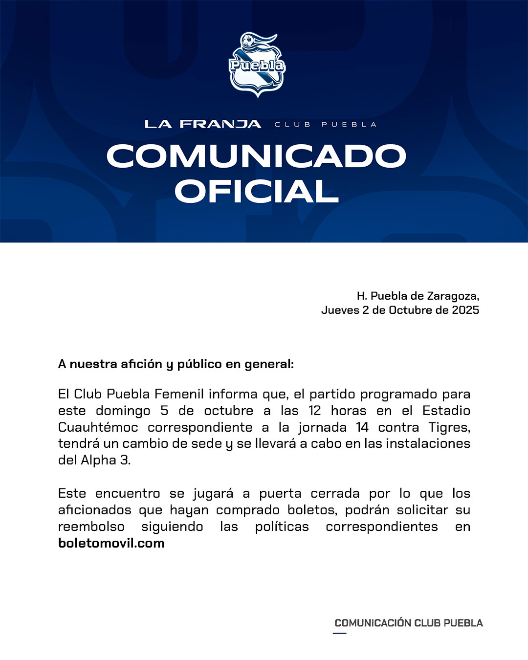 "El Club Puebla Femenil informa que, el partido programado para este domingo 5 de octubre a las 12 horas en el Estadio Cuauhtémoc correspondiente a la jornada 14 contra Tigres, tendrá un cambio de sede y se llevará a cabo en las instalaciones del Alpha 3", detalló el conjunto poblano.
