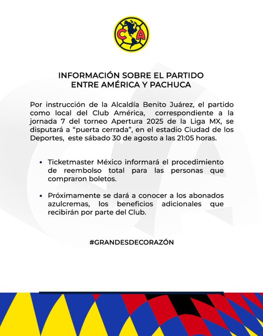 "Por instrucción de la Alcaldía Benito Juárez, el partido como local del Club América, correspondiente a la Jornada 7 del torneo Apertura 2025 de la Liga MX, se disputará a 'puerta cerrada', en el estadio Ciudad de los Deportes, este sábado 30 de agosto a las 21:05 hrs".