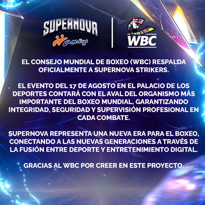 "(Supernova Boxing) contará con al aval del organismo más importante del boxeo mundial, garantizando integridad, seguridad y supervisión profesional en cada combate. Supernova presenta una nueva era para el boxeo, conectando a las nuevas generaciones a través de la fusión entre deporte y entretenimiento digital. Gracias al WBC por creer en este proyecto"