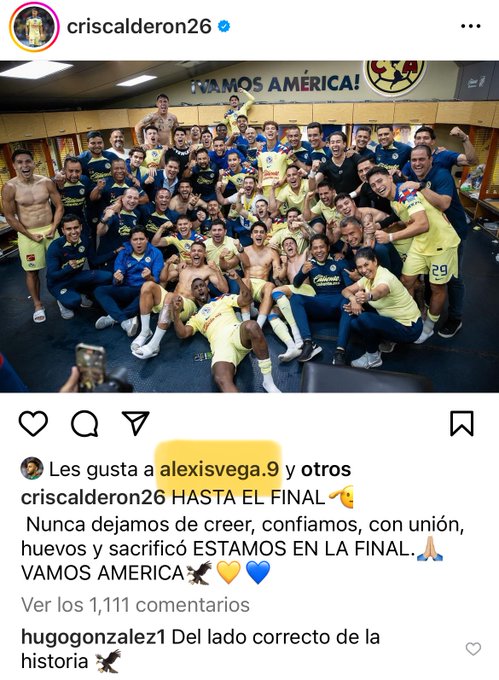 Como era de esperarse, tras amarrar el boleto a la llave por el título varios jugadores de las Águilas usaron sus redes sociales para festejar con fotos y mensajes el pase a la Final, situación que habría aprovechado Alexis Vega para 'coquetear' con los azulcremas.