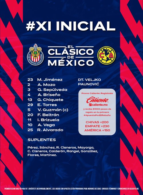 Con estas alineaciones, tanto Chivas como América intentarán tomar ventaja en la Ida de la Semifinal, en duelo que arranca a las 20:10 horas en el Estadio Akron; la Vuelta será el domingo a las 20:00 horas en el Estadio Azteca.