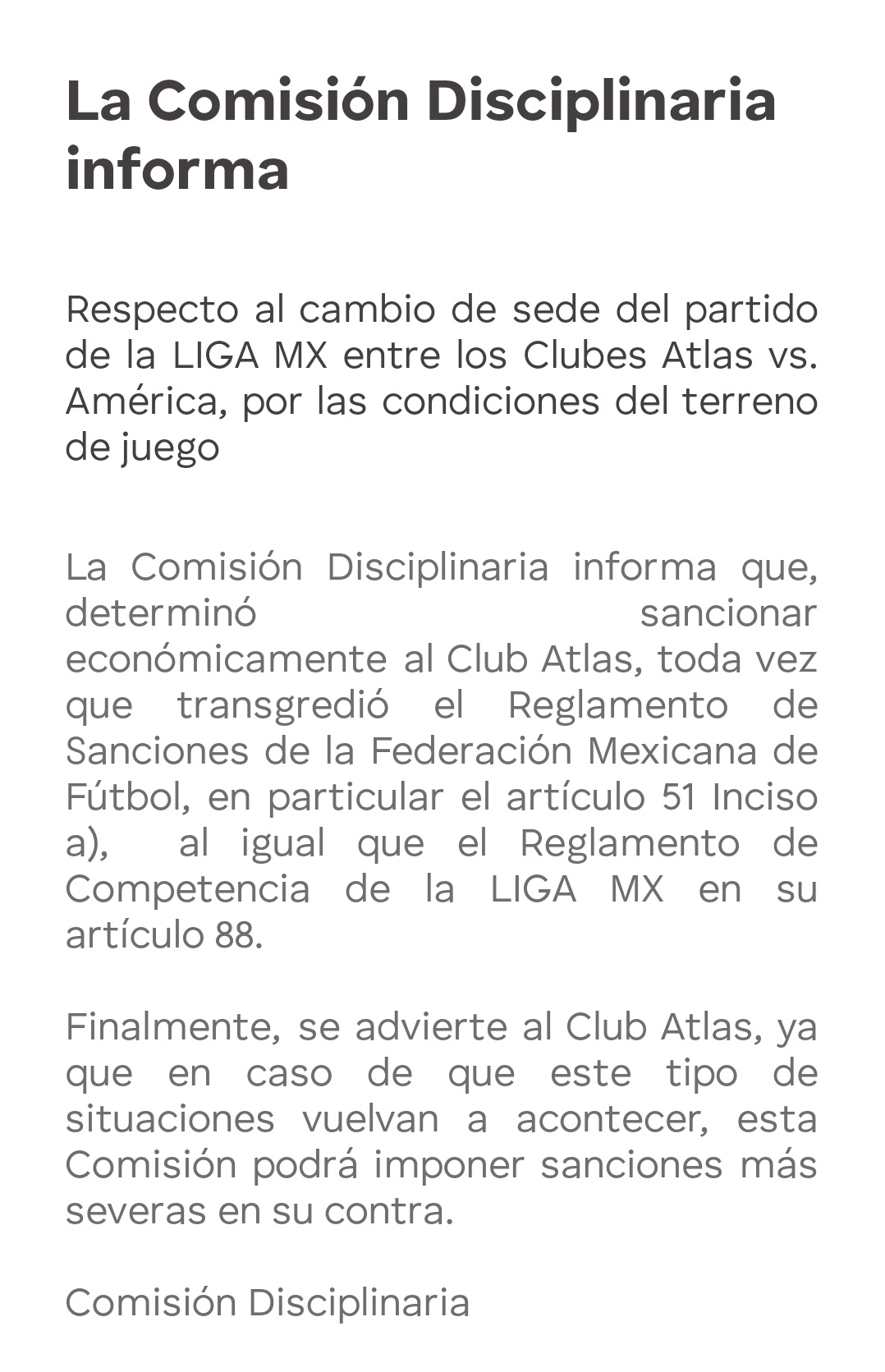 "La Comisión Disciplinaria informa que, determinó sancionar económicamente al Club Atlas, toda vez que transgredió el Reglamento de Sanciones de la Federación Mexicana de Fútbol, en particular el artículo 51 Inciso a), al igual que el Reglamento de Competencia de la LIGA MX en su artículo 88"