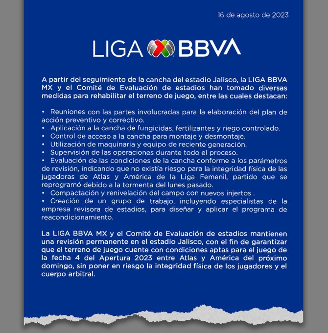 En el Estadio Jalisco trabajan a marchas forzadas para tener en condiciones aceptables la cancha y así albergar el duelo entre el Atlas y el América, correspondiente a la Jornada 4 del Apertura 2023, y hasta este jueves, no ha habido objeción de la Liga MX para que se realice dicho cotejo.