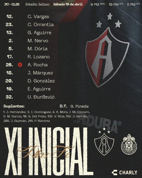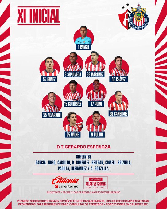 Atlas arrancará con Camilo Vargas en la portería; Carlos Orrantia, Matheus Doria, Gaddi Aguirre, Hugo Martín Nervo y Rivaldo Lozano en la zaga; Aldo Rocha y Jeremy Márquez en la contención, mientras que Diego González, Eduardo Aguirre y Uros Durdevic aparecen en el ataque.