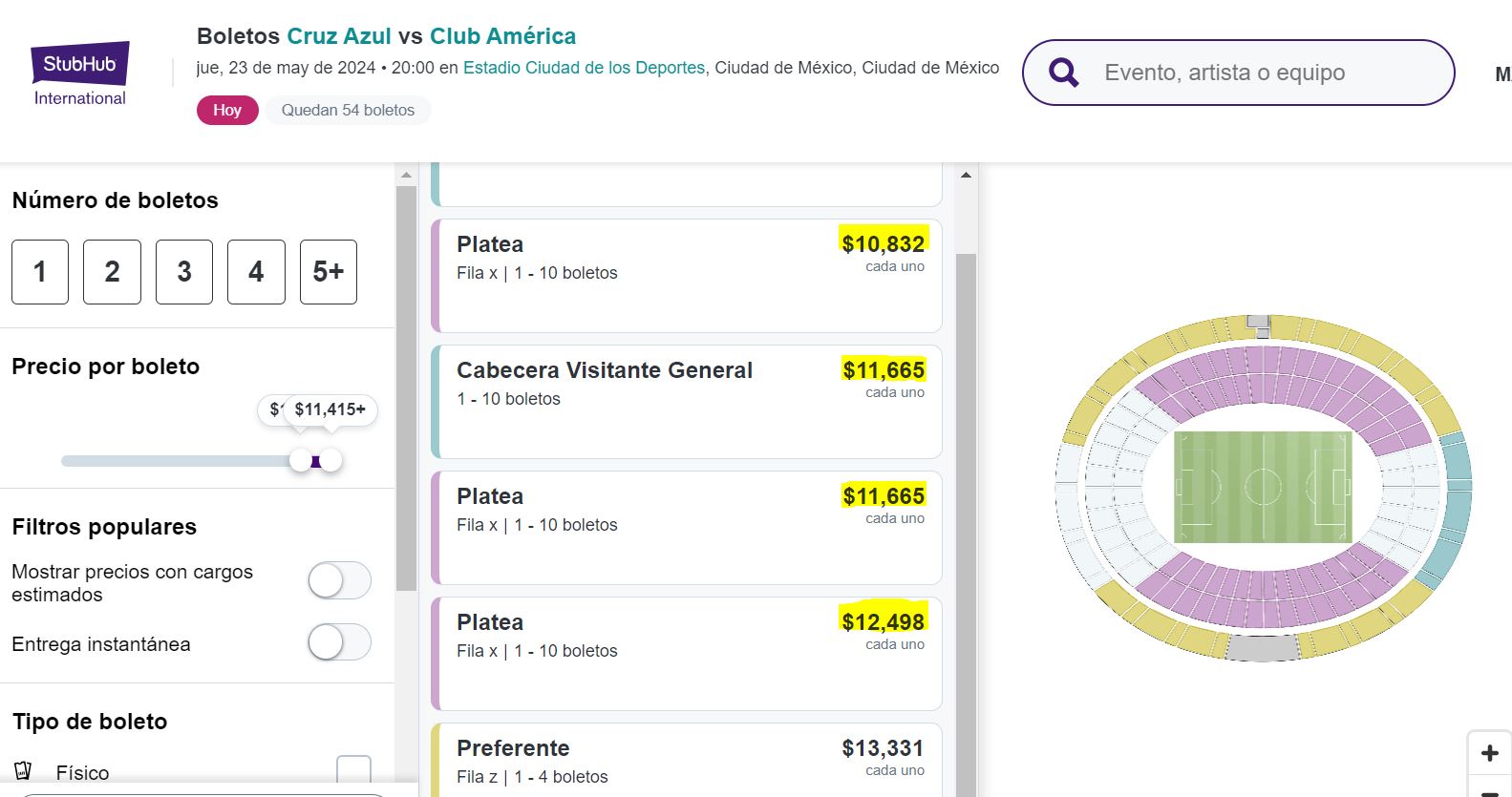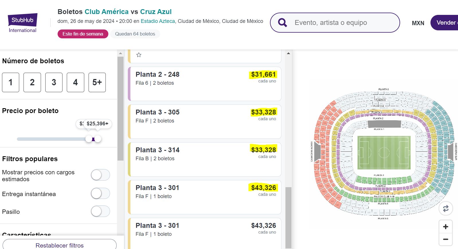 En sitios como Stubhub, empresa que se dedica al intercambio y reventa de boletos de forma legal, se pueden encontrar boletos para el juego del próximo domingo en el Estadio Azteca que superan los 43 mil pesos mexicanos.