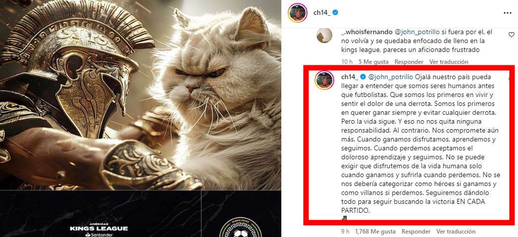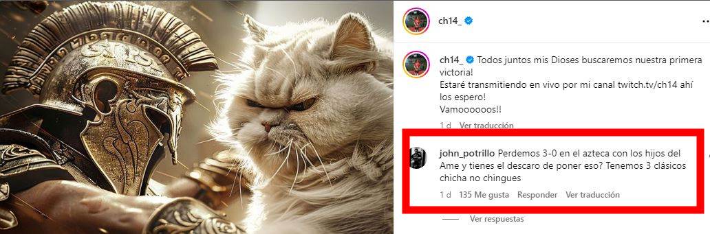 A través de su cuenta de Instagram, Hernández Balcázar publicó una imagen para invitar a todos su seguidores a ver el duelo entre Olimpo United —su equipo— y Persas FC, posteo en el que el usuario @john_potrillo utilizó para expresar su sentir.