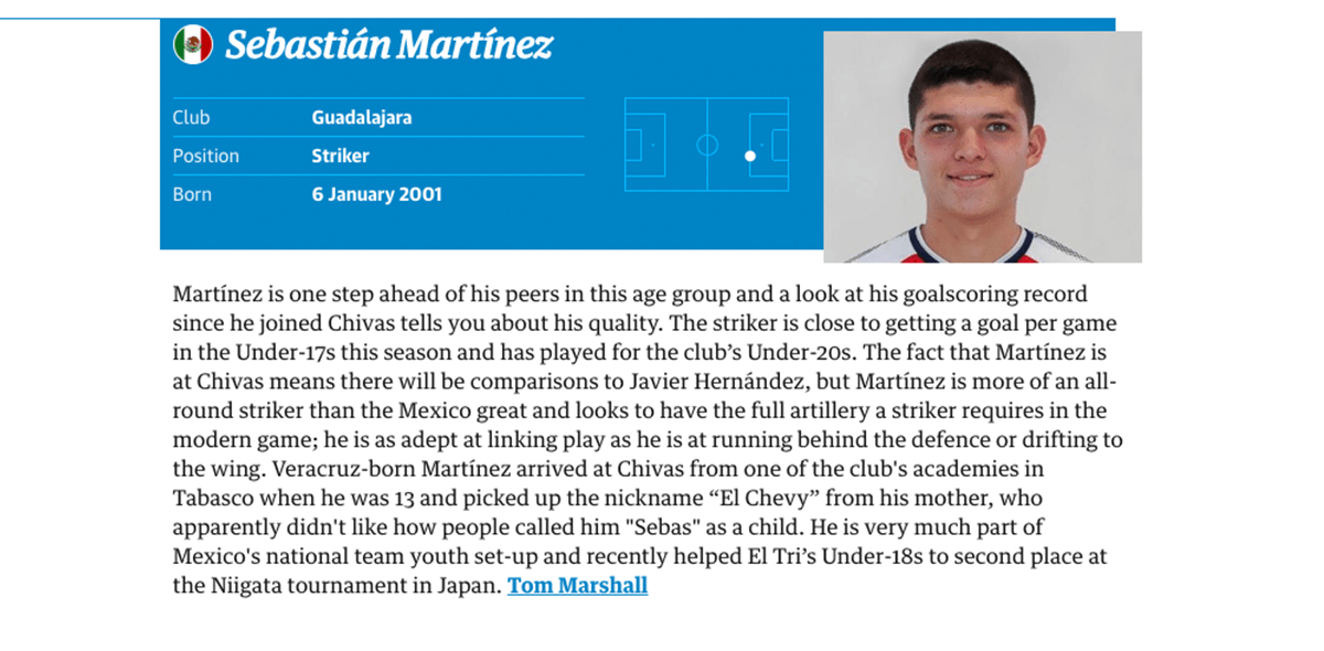 "Martínez está un paso por delante de sus compañeros en este grupo. Su récord de anotaciones desde que se unió a Chivas es una muestra de su calidad", reseñó en la publicación el periodista Tom Marshall.