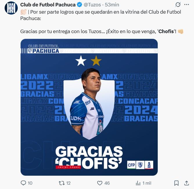 "El Club de Futbol Pachuca informa que, de mutuo acuerdo, Javier Eduardo López deja de ser jugador de nuestra institución a partir de hoy", detalló el club hidalguense.