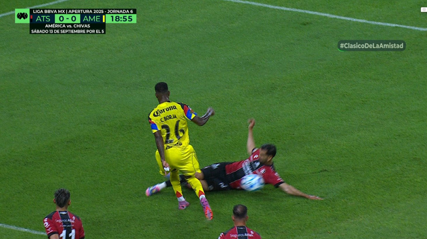 "Durante el partido en mención, el árbitro tomó determinaciones con base en el reglamento vigente. A continuación, se explican algunas de las jugadas que causaron polémica y la base técnica que sustentó sus decisiones: 1. Penal a favor del América por mano (minuto 18): El árbitro sancionó penal por mano del jugador #13 de Atlas (se trata de una mano de bloqueo que ocupa un espacio mayor al natural). 2. Gol anulado al Atlas por fuera de juego (minuto 55): EI VAR le informó al árbitro que previo al gol, el jugador se encontraba en posición de fuera de juego, por lo que el árbitro rectificó su decisión, anulando el gol”, se aclaró.