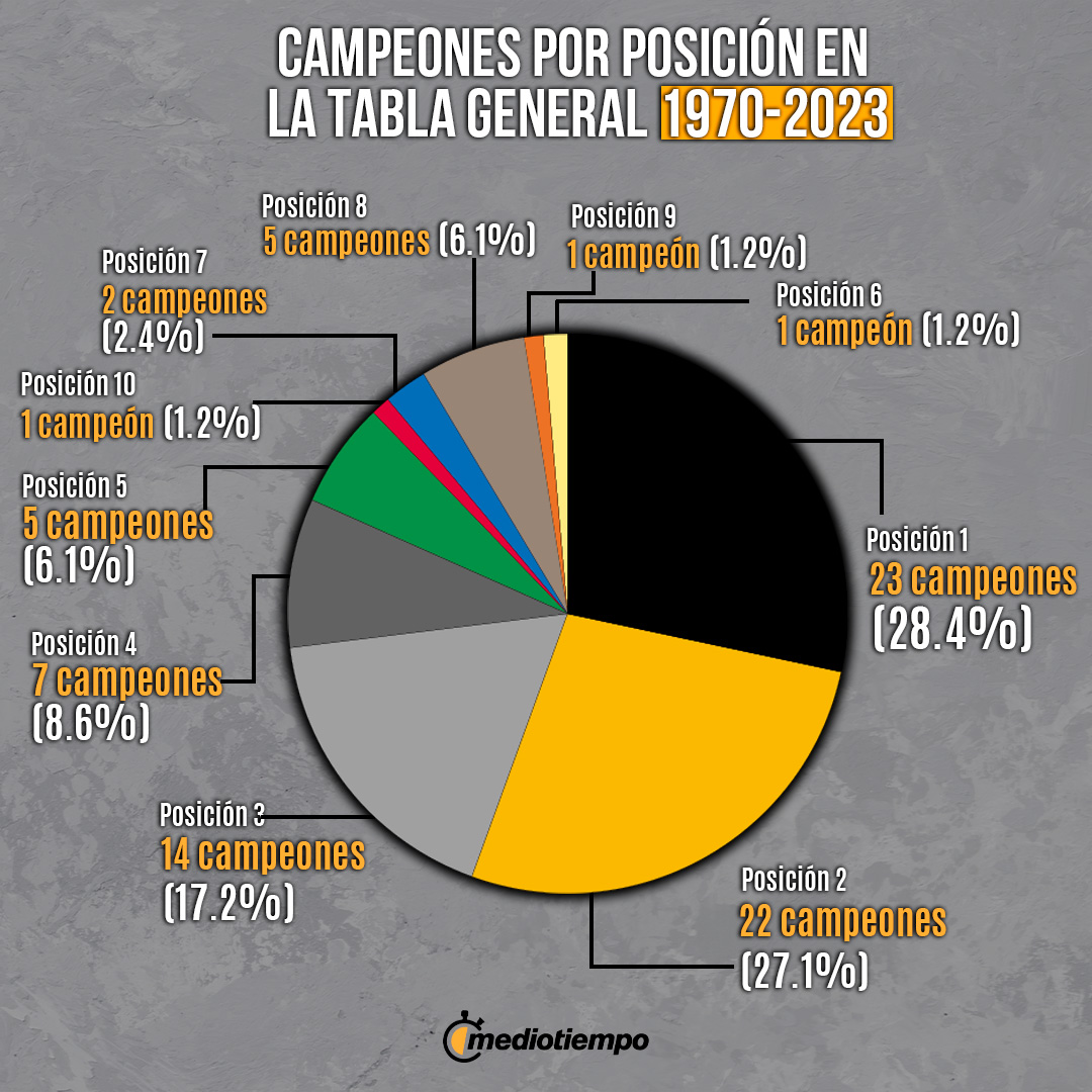 De todos los equipos que han terminado campeones por posición en la Tabla entre 1970 y 2023, el 72.8 % los han ganado los primeros tres lugares. De ellos el líder ha conseguido el campeonato en 23 ocasiones (28.4%) y los que terminan sublíder lo han hecho 22 veces (27.1%).