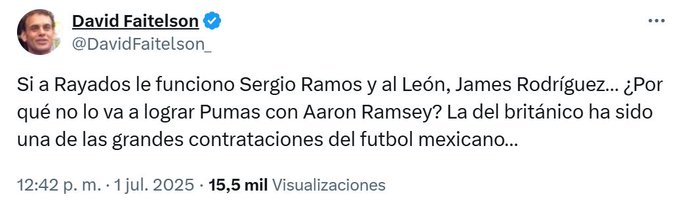 "Si a Rayados le funciono Sergio Ramos y al León, James Rodríguez… ¿Por qué no lo va a lograr Pumas con Aaron Ramsey? La del británico ha sido una de las grandes contrataciones del futbol mexicano…", publicó.