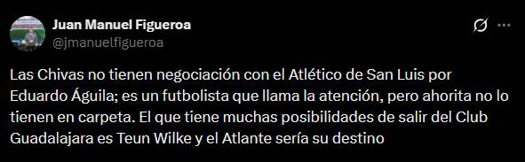 De acuerdo a Juan Manuel Figueroa, Águila es un futbolista que llama la atención en Chivas, pero no hay negociación con el Atlético San Luis.