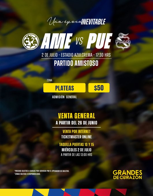 Las Águilas dieron a conocer que las entradas para el duelo ante Puebla tendrán un costo de 50 pesos y en Especial Club 165; la venta general comenzó el pasado jueves.