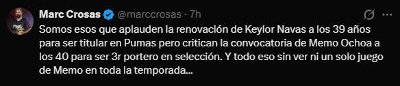 "Somos esos que aplauden la renovación de Keylor Navas a los 39 años para ser titular en Pumas pero critican la convocatoria de Memo Ochoa a los 40 para ser 3r portero en selección. Y todo eso sin ver ni un solo juego de Memo en toda la temporada"