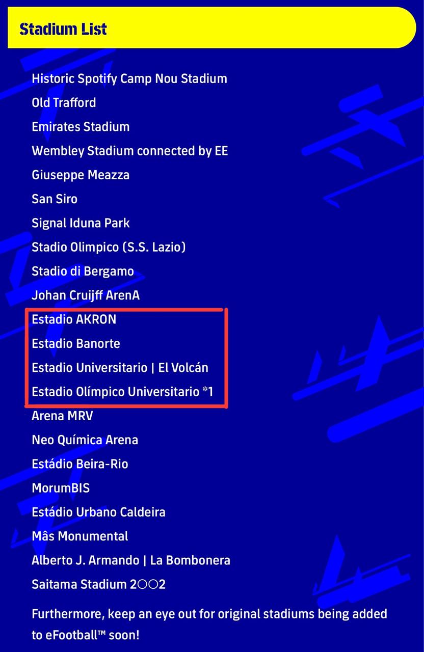 Tanto en Estadio Azteca, el Estadio Akron como el Estadio Olímpico Universitario y el Estadio Universitario también cuentan con licencia en este videojuego, todo precisamente porque los clubes son partners y Konami ha invertido para el disfrute de los aficionados.