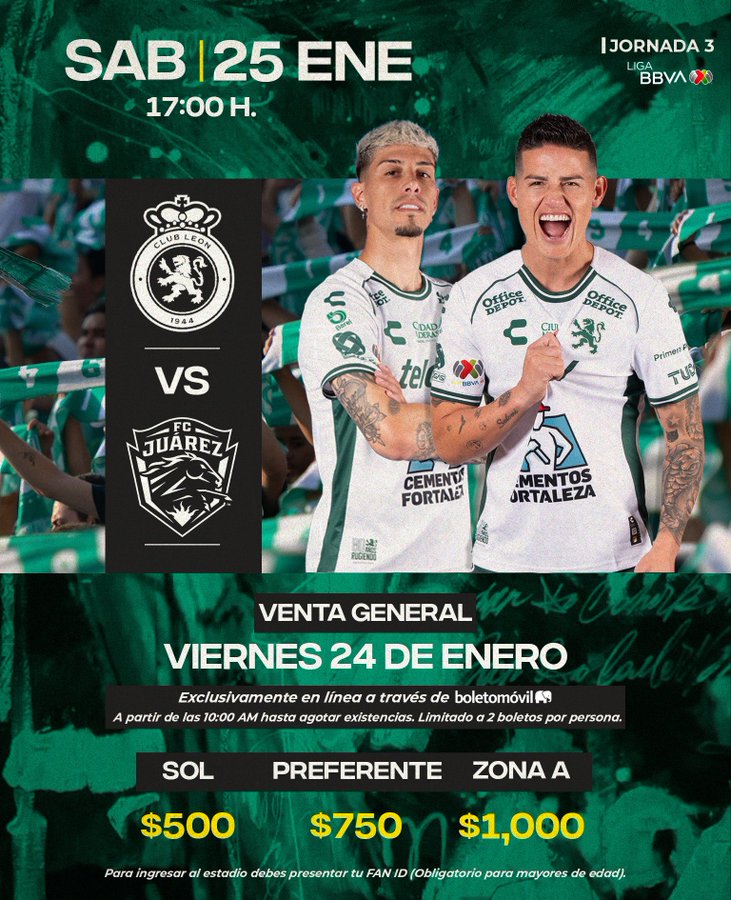 León dio a conocer los precios para los boletos del partido ante FC Juárez, el cual se espera que tenga una gran entrada debido a que será el primer partido de James Rodríguez en calidad de local en la Liga MX.