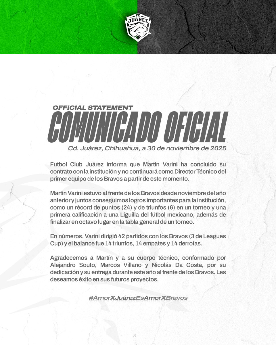 "Martín Varini estuvo al frente de los Bravos desde noviembre del año anterior y juntos conseguimos logros importantes para la institución, como un récord de puntos (24) y de triunfos (6) en un torneo y una primera calificación a una Liguilla del futbol mexicano, además de finalizar en octavo lugar en la tabla general de un torneo"