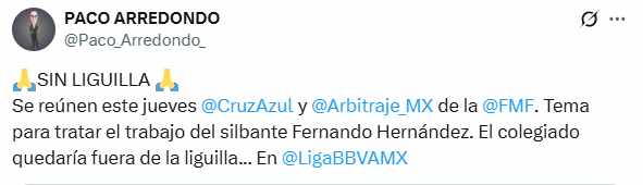 Paco Arredondo, columnista de mediotiempo, fue quien dio a conocer la información y aseguró que Cruz Azul y la Comisión de Árbitros sostendrán una plática este jueves.
