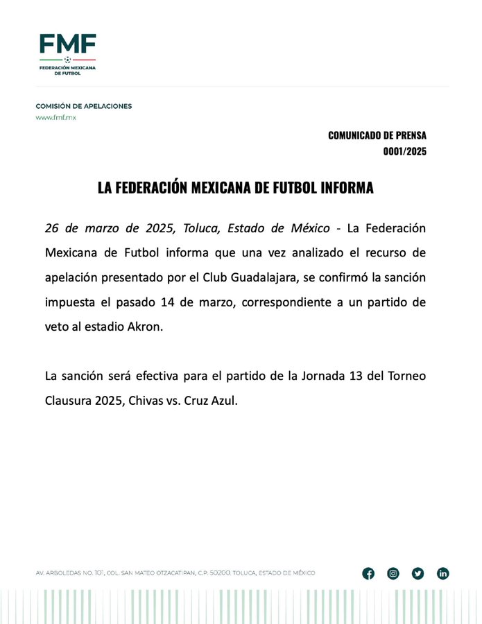 “La Federación Mexicana de Futbol informa que una vez analizado el recurso de apelación presentado por el Club Guadalajara, se confirmó la sanción impuesta el pasado 14 de marzo, correspondiente a un partido de veto al Estadio Akron. La sanción será efectiva para el partido de la Jornada 13 del Torneo Clausura 2025, Chivas vs. Cruz Azul”