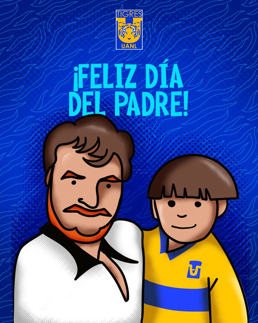Este Día del Padre los Tigres de la Universidad Autónoma de Nuevo León publicaron una peculiar felicitación para sus seguidores, con una ilustración de un hombre sosteniendo a un pequeño vestido con la camiseta amarillo y azul, pero, ¿sabías que la original pertenece a un ídolo felino?