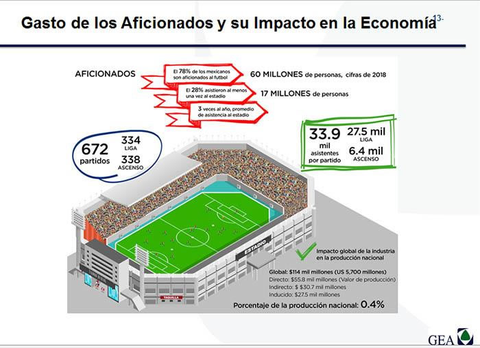 Con 78 por ciento de los mexicanos declarados como aficionados al futbol, esta industria genera 193 mil 200 empleos, con una derrama salarial de 25 mil millones de pesos anuales.