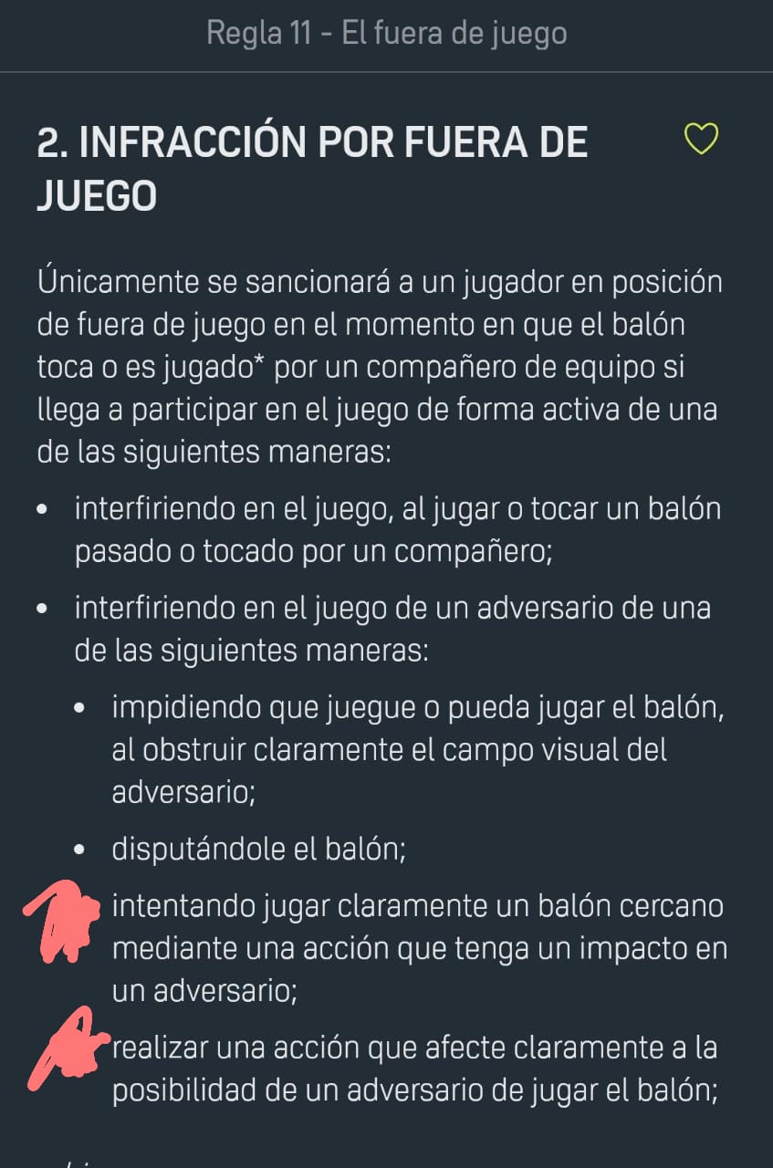 La Regla 11 (Fuera de juego) explica que 'únicamente se sancionará a un jugador en posición de fuera de juego si intenta jugar claramente un balón cercano mediante una acción que tenga un impacto en un adversario'.