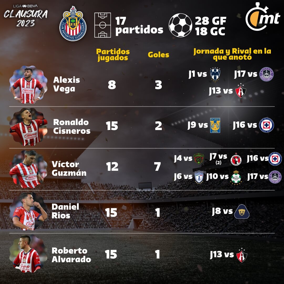 Por Chivas, Víctor Guzmán fue el máximo anotador con 7 goles; tan pronto como fue enviado a la cancha dio resultados, se puso el gafete de capitán y disputó mil 189 minutos en los que registró 31 disparos a la portería.