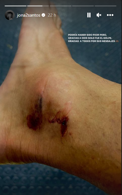 "Podría haber sido peor pero gracias a Dios sólo fue el golpe. ¡Gracias a todos por sus mensajes!", fue el texto con el que Dos Santos acompañó la instantánea.