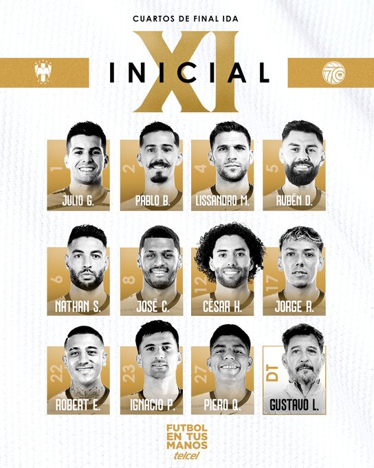 El Club Universidad Nacional de Gustavo Lema saldrá a la cancha del Estadio BBVA con Julio González, Pablo Bennevendo, Lisandro Magallán, Nathan Silva, Rubén Duarte, Robert Ergas, José Caicedo, Piero Quispe, Jorge Ruvalcaba, Ignacio Pussetto y César Huerta.