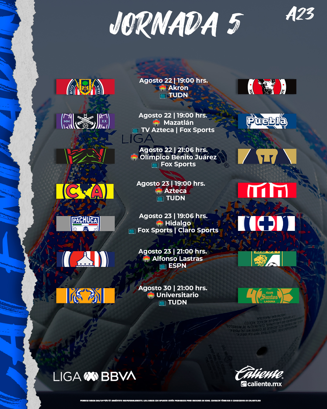 A las 19:00 horas se pondrá en marcha la Jornada 5, que inicia el martes 22 de agosto en el Estadio Akron, con el Chivas vs. Tijuana, mismo día y horario para el Mazatlán vs. Puebla, y cierra la actividad de ese día el FC Juárez vs. Pumas a las 21:06 horas.