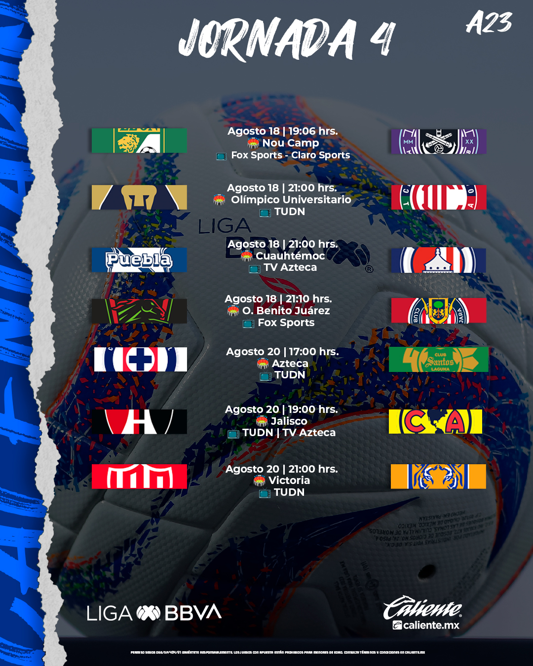 La Jornada 4 se abre el 18 de agosto con el León vs. Mazatlán FC a las 19:06 horas en la casa de La Fiera, y ese viernes habrá otros 3 duelos, pues Puebla vs. Atlético de San Luis, Pumas vs. Necaxa y FC Juárez vs. Chivas también se disputarán a las 21:00 horas en los dos primeros casos, y a las 21:06 en el cuarto cotejo.