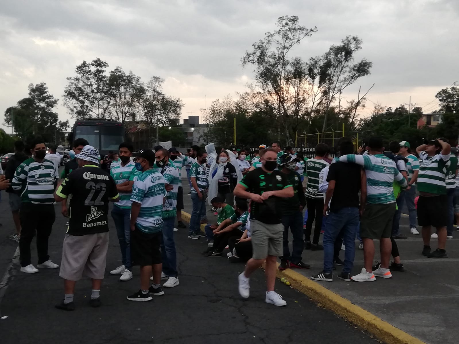 Media hora antes del arranque del juego, los aficionados visitantes estaban por tomar sus autobuses para dirigirse a Plaza Garibaldi y ahí ver el juego, donde el equipo lagunero busca alzar su séptimo campeonato de Liga.