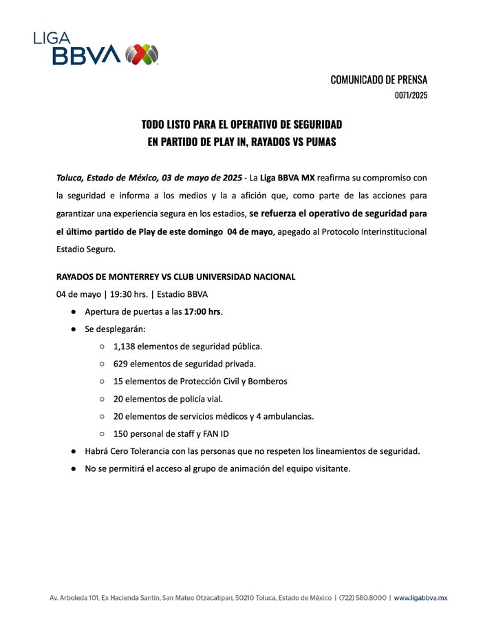 La Liga MX dio a conocer que para el juego entre Rayados y Pumas, el cual se disputará en el Estadio BBVA, implementará un reforzado operativo de seguridad.