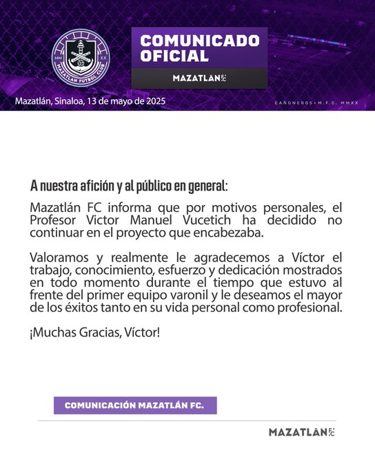Mazatlán FC dio a conocer que Víctor Manuel Vucetich tomó la decisión de no continuar al frente del equipo para la próxima campaña de la Liga MX.
