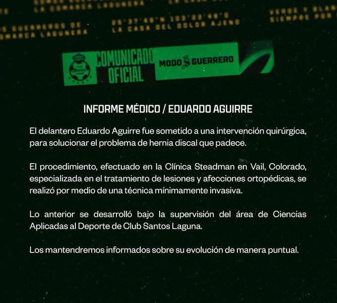 Santos podría sufrir la baja de su delantero Eduardo Aguirre, quien tuvo que ser intervenido quirúrgicamente por una hernia discal que padecía, informó el cuadro lagunero a través un comunicado que divulgaron en sus redes sociales.