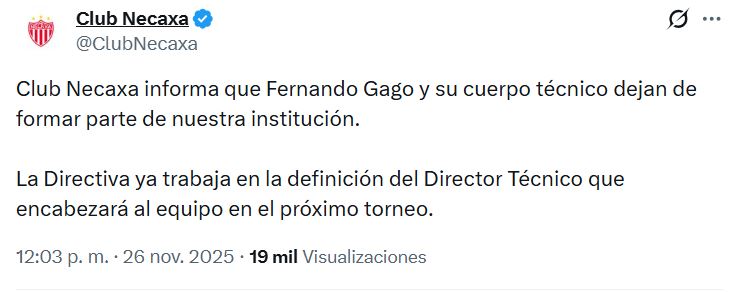 “Club Necaxa informa que Fernando Gago y su cuerpo técnico dejan de formar parte de nuestra institución. La Directiva ya trabaja en la definición del Director Técnico que encabezará al equipo en el próximo torneo", comunicaron los Rayos.