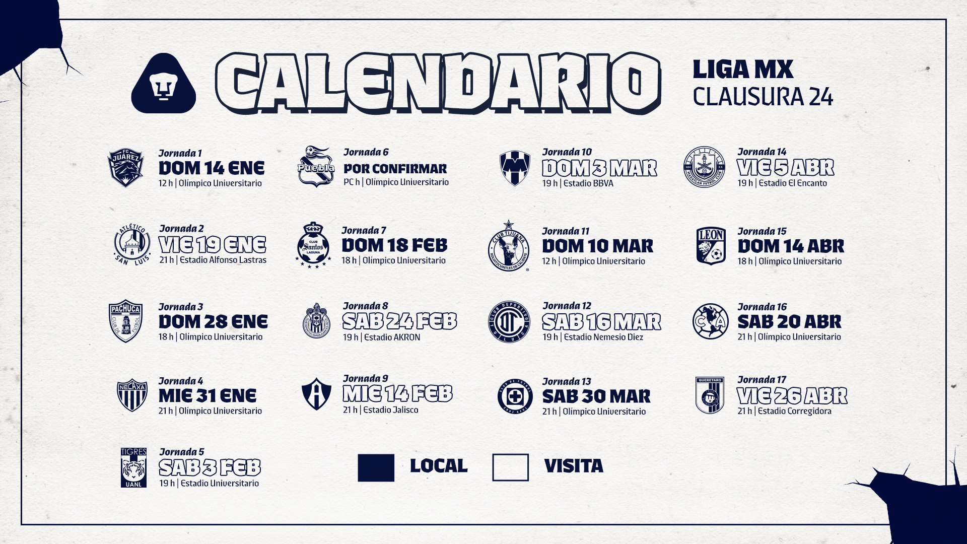 - Jornada 1 | FC Juárez | 12:00 | Domingo 14 de enero