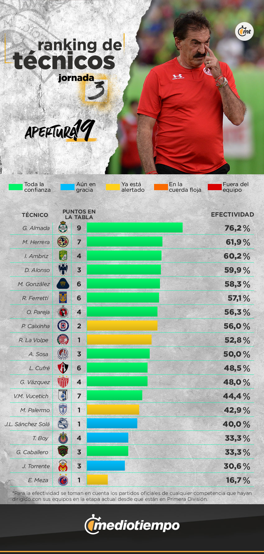 Muy mal inicio de torneo el que han tenido tanto Pedro Caixinha con Cruz Azul, como Ricardo Antonio La Volpe con Toluca. La goleada que sufrió la Máquina, tiene a los cementeros en la posición 15, mientras que los Diablos merodean el sótano de la clasificación. En la punta, se afianzan Guillermo Almada y Víctor Manuel Vucetich.